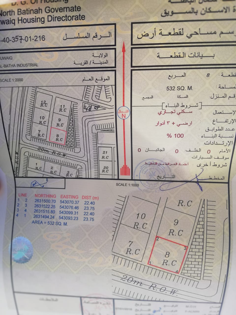 رقم القطعة : 8 / المساحة : 532 متر مربع