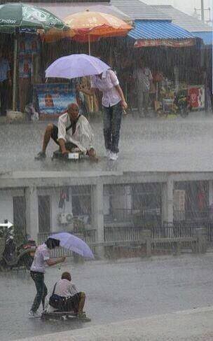 شدتني كثيرا هذه الصورة التي نرى فيها امرأة تساعد رجلا معوقا تحت الأمطار الغزيرة .. بينما يكتفي بعض الرجال في الخلف بالمشاهدة ..!
