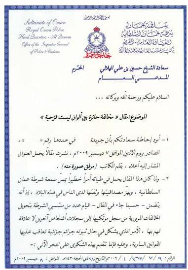بعدَ يومٍ واحدٍ من نشرِ المقال وجَّه مالك بن سليمان رسالة إلى حسين الهلالي المدعي العام الرسالة الموجودة في الصورة أعلاه. ومن باب العِلم فإنَّ الادعاء العام في عُمان يُشرفُ عليه مالك بن سليمان مذ إنشائه، والموضوع في شقِّه القانوني لا دراية لي به ولذلك لن أخوض فيه ولكن من باب