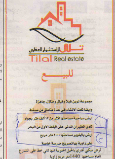 أرفق لكم صورة من الاعلان اليومي الوارد في صفحة الاعلانات رقم 9 بجريدة الوطن في قسم العقارات في ابريل 2008.