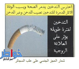 وبعد فشل كافة وسائل إقناع المدخنين بالإقلاع عن تلك العادة السيئة، لم تجد وزارة الصحة المصرية أي "فزاعة" ترهب بها مدمني السجائر سوى إستمالات التخويف الجنسي، حيث ألزمت شركات الدخان بوضع صورة مبتكرة على جميع علب السجائر لسيجارة منحنية وقد كتب إلى جوارها عبارة "التدخين لفترة طويلة يؤثر على العلاقة الزوجية".