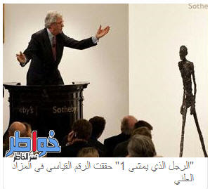 فقد اشترى الرجل، الذي بقيت هويته مجهولة، تمثال "الرجال الذي يمشي 1" للفنان ألبيرتو جياكوميتي، خلال مزايدة في دار "سوذبيز" لم تزد على ثمانية دقائق، وذلك بالاتصال هاتفياً، وبسعر وصل إلى 104.3 ملايين دولار، لتتفوق على أعلى سعر عالمي لقطعة فنية بنحو 200 ألف دولار، حيث بيعت لوحة "الولد ذو الغليون" لبيكاسو بسعر وصل إلى 104.1 ملايين دولار.