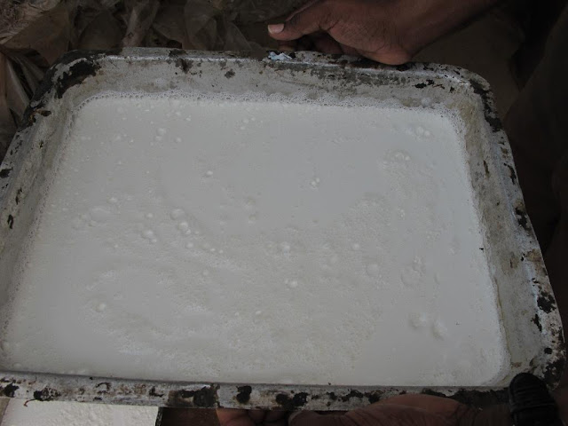 تحفر قنوات صغيرة على شجرة المطاط وينزل من الشجرة مادة بيضاء كالحليب تجمع لتوضع في آنية كما في الصورة، عندما تتحول المادة إلى مطاط صلب بعض الشيء يجفف في الشمس ثم يباع لمصانع إطارات السيارات، بينما نحن نتحدث مع المزارع رأيت ابنته الصغيرة تقف بعيداً عنا مسندة ظهرها لجدار البيت فالتقطت هذه الصورة: