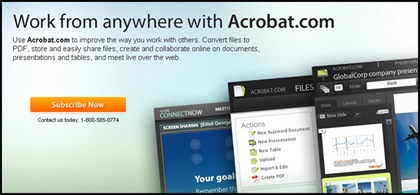 موقع أكروبات هو ملك لشركة أدوبي، ومن خلاله تقدم مجموعة من تطبيقات الويب تغنيك عن برامج الأوفيس، هناك تطبيقات للــ video conferencing حيث يمكنك أنت ومجموعة من زملاء العمل الاجتماع بالصوت والصورة مع مشاركة الملفات والعروض التقدمية وغيرها من الخدمات.يمكنك التسجيل مجانا لتجربة بعض هذه التطبيقات، وأرجو أن تفعل هذا لتعرف مدى قوة هذه التطبيقات.