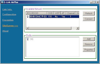 بالضغط على SiteSurvey الموجود على اليسار, يمكننا مشاهدة نقاط الاتصال الموجودة في مدى كرت الشبكة , نستطيع اختيار نقطة الاتصال المراد الاتصال بها و الدخول في الشبكة الخاصة بها ( في حال وجود اكثر من نقطة اتصال في نفس المنطقة) نظللها و نضغط على Connect فيقوم كرت الشبكة بالاتصال بنقطة الاتصال هذه, الصورة توضح نقطة اتصال واحدة موجودة في نفس المدى: