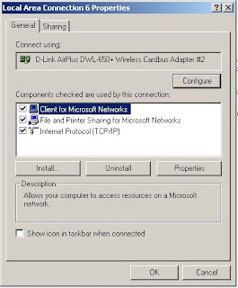 اتجه الى start ثم settings ثم control panel ثم Network and dial up connections, الان بالزر الايمن انقر نقرة على الLocal Area Connection الذي تم عمله لكرت الشبكة اللاسلكية و ستحصل على التالي: