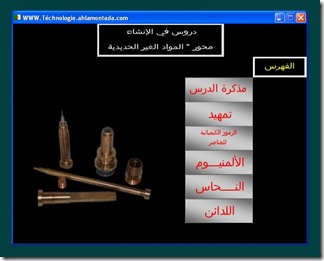 يحتوي هذا الدرس على واجهة بالفلاش من خلالها تتنقل لدروس الخاصة بالمعادن الغير الحديدية : الألمنيوم ، النحاس ، اللدائن. و لكل درس 3 ملفات بإمتداد Word - Pdf - Power point .و هو من إنجاز الأستاذ : رشيد شيخ - الجزائر .يتوافق هذا الدرس مع منهاج السابعة أساسي بالجمهورية التونسية لمحور المواد المستعملة . عمل مميز و أشكر السيد رشيد على هذا الدرس القيم.