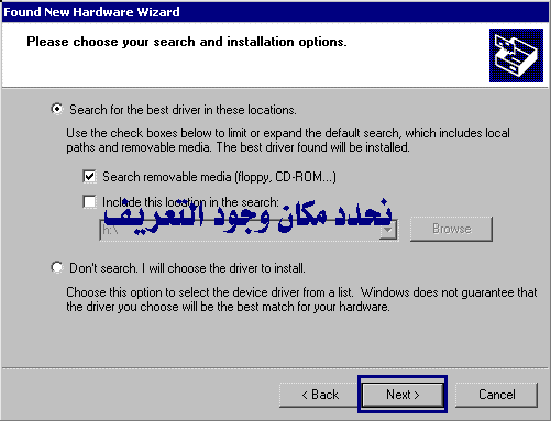 4- تعريف الوصلة الخاصة ،، وإما أن يكون على فلوبي ديسك أو سيدي ،، مع العلم بأن بعض أنواع الوصلات يتم تعريفه بشكل افتراضي من ويندوز اكس بي ،، لكن بعضها يجب توفر التعريف الخاص بها ..