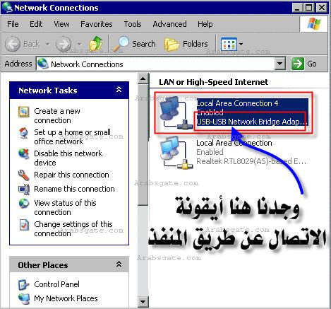 وبعد ذلك يأتي دور تعريف الجهازين برقم IP خاص لكل منهما حتى يكتمل عمل الشبكة ،، كما ولو أن هناك كرت شبكة وكيبل بين الجهازين ،، ويتم ذلك بالذهاب إلى خصائص الشبكة .. بكبسة يمين على (My Network Places) .. ثم (Properties) .. سنجد الصورة التالية :-
