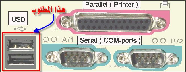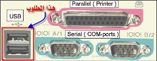 1- أن يكون الجهازان مزودان ببورت الـ(USB) في اللوحة الأم ،، ويظهر ذلك من خلال النظر خلف صندوق الكمبيوتر ورؤية المنافذ المتواجدة .. كما في الشكل التالي :-
