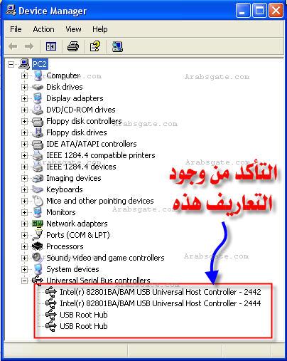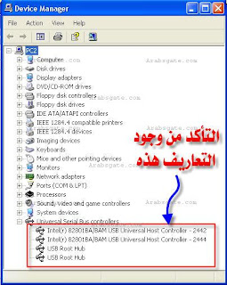 2- الذهاب إلى خصائص جهاز الكمبيوتر ،، ثم إلى (Device Manager) والتأكد من أن بورت الـ(USB) معرف هناك ، كما في الصورة التالية :-