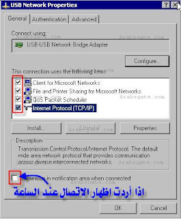 وبالتالي يتم التعامل معه الآن كأنه كرت شبكة ،، بحيث يتم تحديد IP له ، ووضع علامة صح عند السماح بمشاركة الملفات والطباعة .. كما في الصورة التالية :-