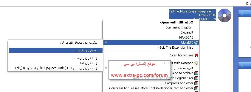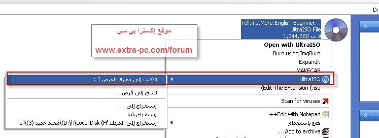 ماذا لو أردنا تشغيل هذا الملف الذي قمنا بنسخه على الجهاز مباشرة دون حرقه (نسخه) على سيدي فارغ او dvd؟ مثلا كان سيدي برامج واردنا تصفح هذه البرامج من الهارديسك كل ما عليك فعله هو التالي اذهب لملف الأيزو الذي تريد تشغيله وكأنه سيدي لكن وهمي واختر كما في الصورة