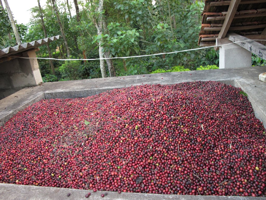 حبوب القهوة تجمع في خطوط طويلة لتجفف