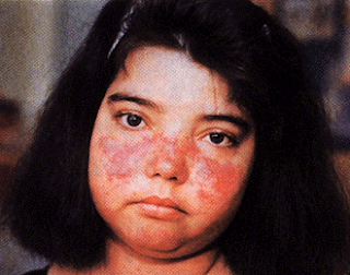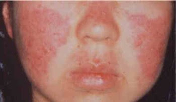 حوالي ثلث إلى نصف المرضى المصابين يصابون بطفح جلدي على الوجه بشكل الفراشة حيث يصيب الخدين ويمتد عبر الأنف