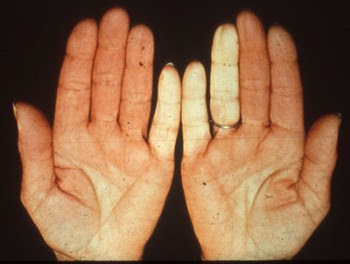 تغير في لون الأطراف عند التعرض للبرد حيث يصبح لونها أبيض ثم أزرق ثم أحمر (ظاهرة رينودRaynaud's sign). التهاب المفاصل