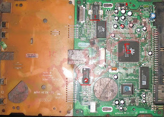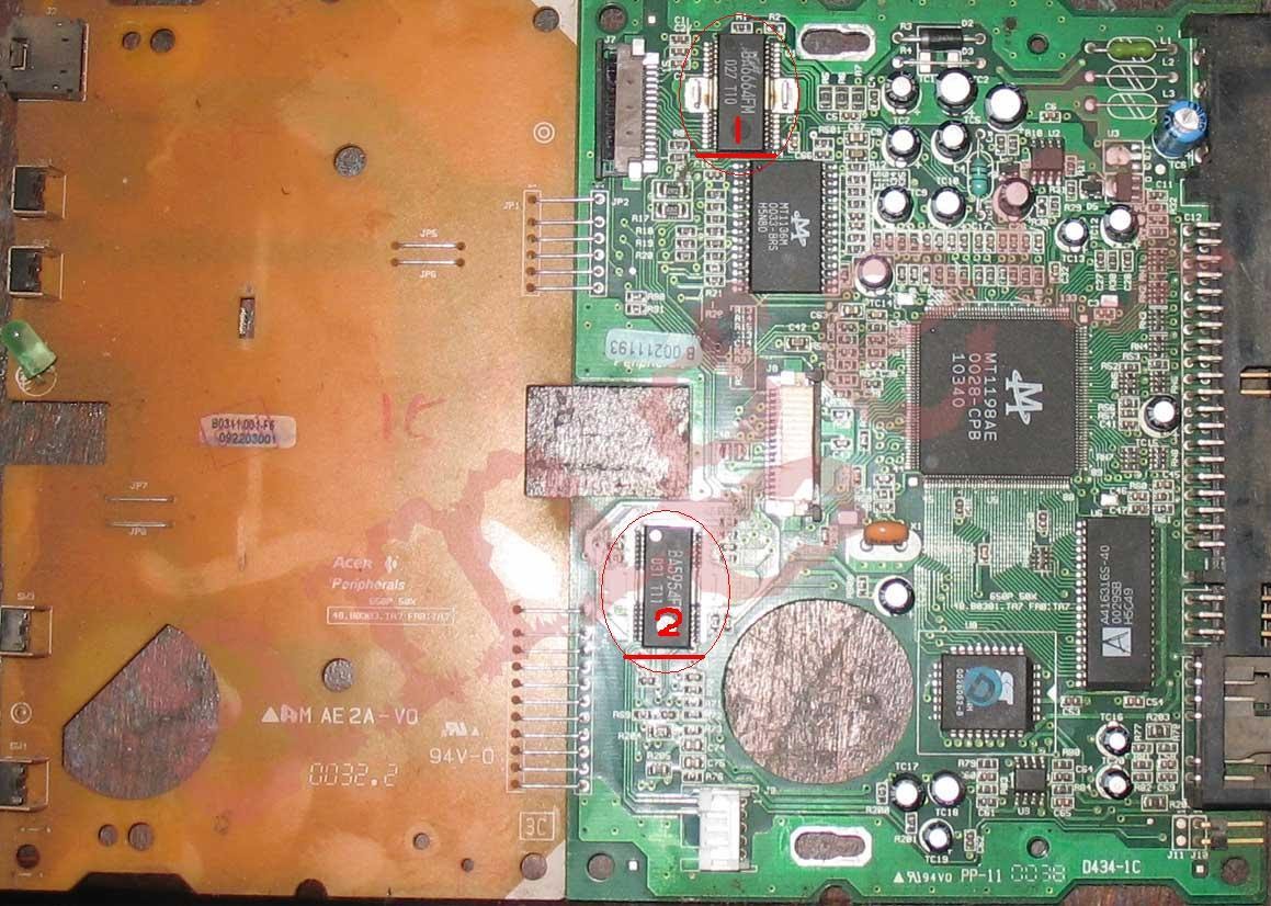 فى هذه الصوره موضح امامنا ايسهان يعتبر هذان الايسهان من اهم ايسهات برده السى دى روم لان احدهما مسئول عن العدسه وخروج الليزر منها والاخر مسئول عن حركه المواتير داخل السى دى ولا يوجد سى دى روم يخلو من هذين الايسين الا نادرا.اذا كانت المشكله مثلا ان العدسه تقراء جيدا وتخرج ليزر ولا يقوم الاسطوانه باى حركه فنقوم بتغير الاى سى رقم واحد ويجب مراعاه الارقام فى معظم الاحيان عند تلف هذا الايسى يرتفع درجه حرارته .