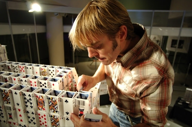 إسم هذا الشخص هو براين بيرج و هو يعتبر أول و الوحيد الذي يعمل في مجال بناء بأوراق اللعب لكن الأعجوبة الكبرى أن براين لا يستعمل غراء أو أي مادة بحيت لو هبت نسمة ريح خفيفة يدهب جهده كله.