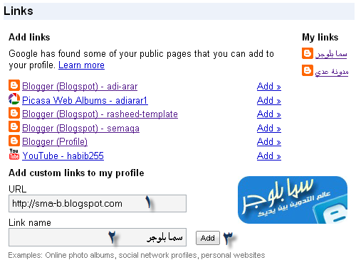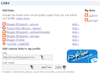 2- بعد ان قمت بالضغط على تعديل وفتح لك لسان جديد - انزل اسفل الصفحة حتى تصل الى تبويب links كما هو موضح في الصورة التالية - عبأ الخانة الاولى برابط مدونتك والخانة الثانية بعنوانها - ثم اضغط على add - وانزل للاسفل واضغط على save changes .