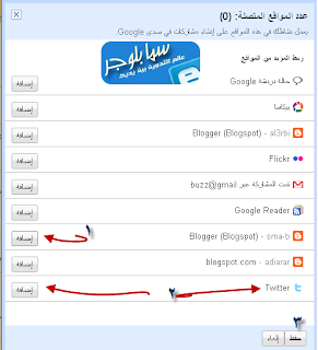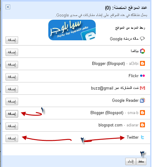 4- بعد ان ضغطت على عرض وتعديل - اضغط على كلمة اضافة مقابل اي رابط تريده - كما يمكنك ان تضيف تحديثات حسابك في تويتر ان وجد مباشرة الى حسابك في google buzz تلقائيا عن طريق وضع اسم المستخدم في تويتر بعد ان تضغط على اضافة - صورة للتوضيح