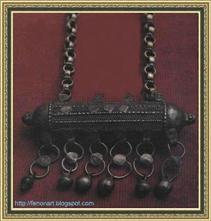 تعليقه حجاب فضه غريبه الشكل عمرها تقريبا من ستين الى سبعين عام من منطقه الخليل , كانت تعلق بسلسله وتلبس حول رقبه المرأه المتزوجه وبها ورقه مكتوبه بالادعيه المختاره للحظ السعيد .