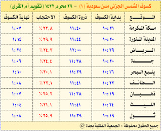 جدول يوضح بداية ونهاية كسوف الشمس الجزئي على مستوى الكرة الأرضية جدول يوضح بداية كسوف الشمس الجزئي لبعض مدن المملكة :