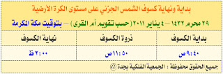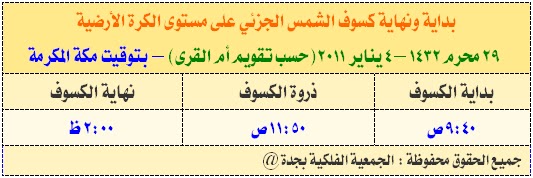الجمعية الفلكية بجدة - بمشيئة الله تعالى تشهد الكرة الأرضية صبيحة يوم الثلاثاء غداً التاسع والعشرون من محرم الجاري الموافق الرابع من يناير 2011 (حسب تقويم أم القرى) كسوف جزئي للشمس مشاهد في سماء الجزيرة العربية والنصف الشمالي من قارة إفريقيا وشرق أسيا وأوروبا . وستكون بداية الكسوف الجزئي على مستوى الكرة الأرضية في الأجزاء الشمالية من إفريقيا عند الساعة 9:40 صباحا بتوقيت مكة المكرمة ويتحرك بعد ذلك مسار الكسوف باتجاه الشرق وذلك يعود إلى طبيعة حركة القمر حول الأرض إلى أن يصل إلى سماء المملكة حيث يبدأ الكسوف الجزئي ما بعد الساعة العاشرة صباحا و ستحظى الأجزاء الشمالية من المملكة بأكبر نسبة في احتجاب لقرص الشمس حيث يصل الجزء المكسوف في أقصى شمال المملكة إلى 43 في المائة وتنخفض كلما اتجهنا جنوبا حيث تصل إلى 13 في المائة في أقصى جنوب المملكة . ويعود السبب في التفاوت في نسبة احتجاب قرص الشمس إلى أن الأجزاء الشمالية للمملكة قريبة من مسار كسوف الشمس الجزئي.