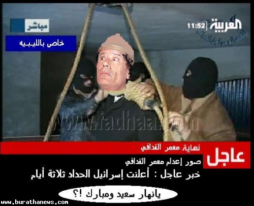 لدينا رئيس هارب واخر مخلوع وقريبا جدا سينضاف الى* الائحة اخر مقتول او معدوم* وهو الزعيم المعتوه والمجنون السيد المعمر القذافي الذي وقع على شهادة اعدامه بجرائمه القذرة ضدا شعبه يقول ان السلطة في يد الشعب لكنه لايجد حرجا في قتل هذا الشعب* بالطائرات الذي دعاه الى الرحيل وترك السلطة على كل اتوقع قريبا جدا ان نسمع* خبر قتل هذا المجنون وخلاص شعب ليبيا من اجرامه وجنونه .