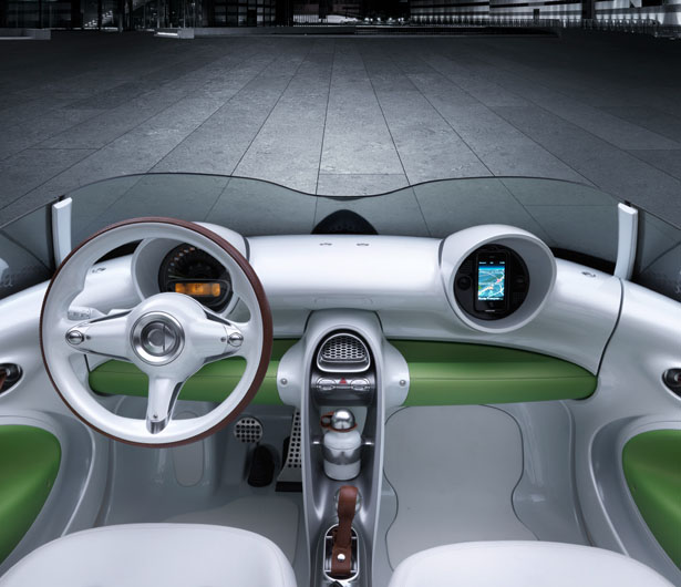 خارجيا لا تحتاج للكلام فحجمها و شكلها و مظهرها يتجاوزون الأناقة و الإبتكار و الروعة.المعدن الرفيع أبيض ذهان يجهلها حقا سيارة تخطف الأنظار في شوارع المدينة في المستقبل.كما أن إستخدام مزيج الزجاج و البلاستك المقوى و لمعان المصابيح الأمامية و الجانبية أعطاها لمسة جمالية لا تضاهى.صممها Daimler.