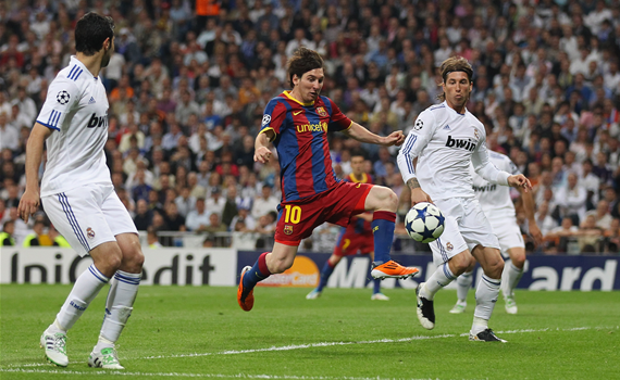 في المباراة الرابعة بين فريقي برشلونة وريال مدريد الإسبانيين، وفي مباراة الذهاب ضمن الدور نصف النهائي لبطولة دوري ابطال أوروبا، تمكن برشلونة من قهر مضيفه ريال مدريد بهدفين نظيفين.