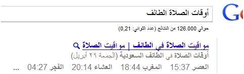 ذكرت مدونة جوجل العربية اضافتهم ميزة معرفة مواقيت الصلاة مباشرة من محرك البحث جوجل وذلك بكتابة كلمة "أوقات الصلاة" متبوعة باسم المدينة المطلوبة حيث ستظهر كاول نتيجة بحث