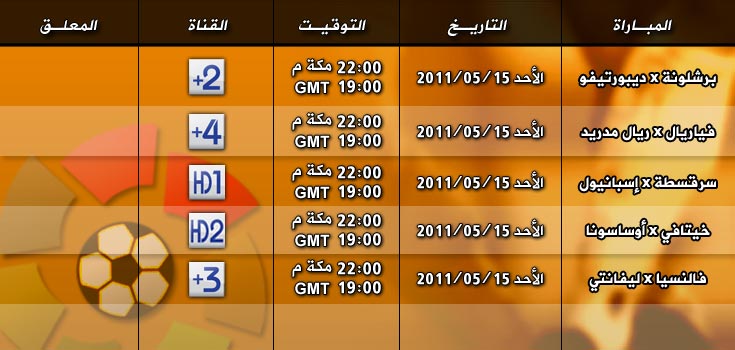 1 【 أبرز مباريات الدوريات والكؤوس الأوروبية خلال الأسبوع 14 / 5 والمنقولة على قنوات الجزيرة الرياضية 】 13 مايو 2011، 2:13 الدوري الأسباني الدوري الايطالي كأس فرنسا كأس إنجلترا