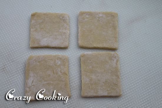 نأخذ مربعات البف بستري وتقطع أربع قطع وترش بالدقيق