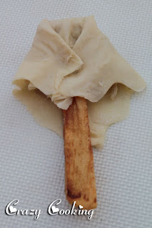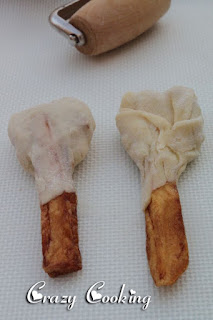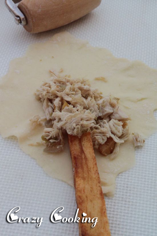 نضع جزء بسيط من الحشوه المحضره بالوسط مع أصبع بطاطس كما في الصوره