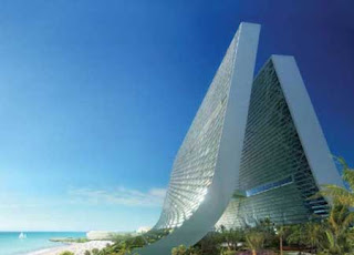 هذه الأبراج الأنيقة التي تنحدر نحو شاطئ البحر هي التَصوُّر المقترح من مكتب أوبنهايم المعماري لأحد المشاريع السكنية الفاخرة في دولة الإمارات العربية المتحدة. والهدف من هذا الشكل الفريد هو تصميم مبنى مستدام يستخدم طاقة نظيفة متجددة، ويضمن وجود أكبر عدد من الشقق السكنية المطلة على شاطئ البحر.