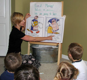 و أثناء النشاط يستخدم المعلم كتباً ذات صور قد يصل ارتفاع صفحاتها إلى 80سم و يقدم قراءةً نموذجية مع إعطاء الطفل الفرصة للتفاعل كتسمية الصور أو الترديد. و يتم أداء النشاط مع مجموعة صغيرة أو كبيرة أو حتى فصل بأكمله. يجلس الأطفال خلال النشاط على الأرض على شكل نصف حلقة أمام المعلم لخلق نوع من الألفة بين المعلم و الأطفال.