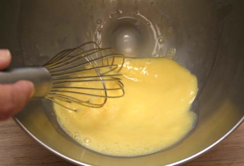 ناخذ البيضتين ونخفقهم باليد الى ان يتخير لونهم ويفتح