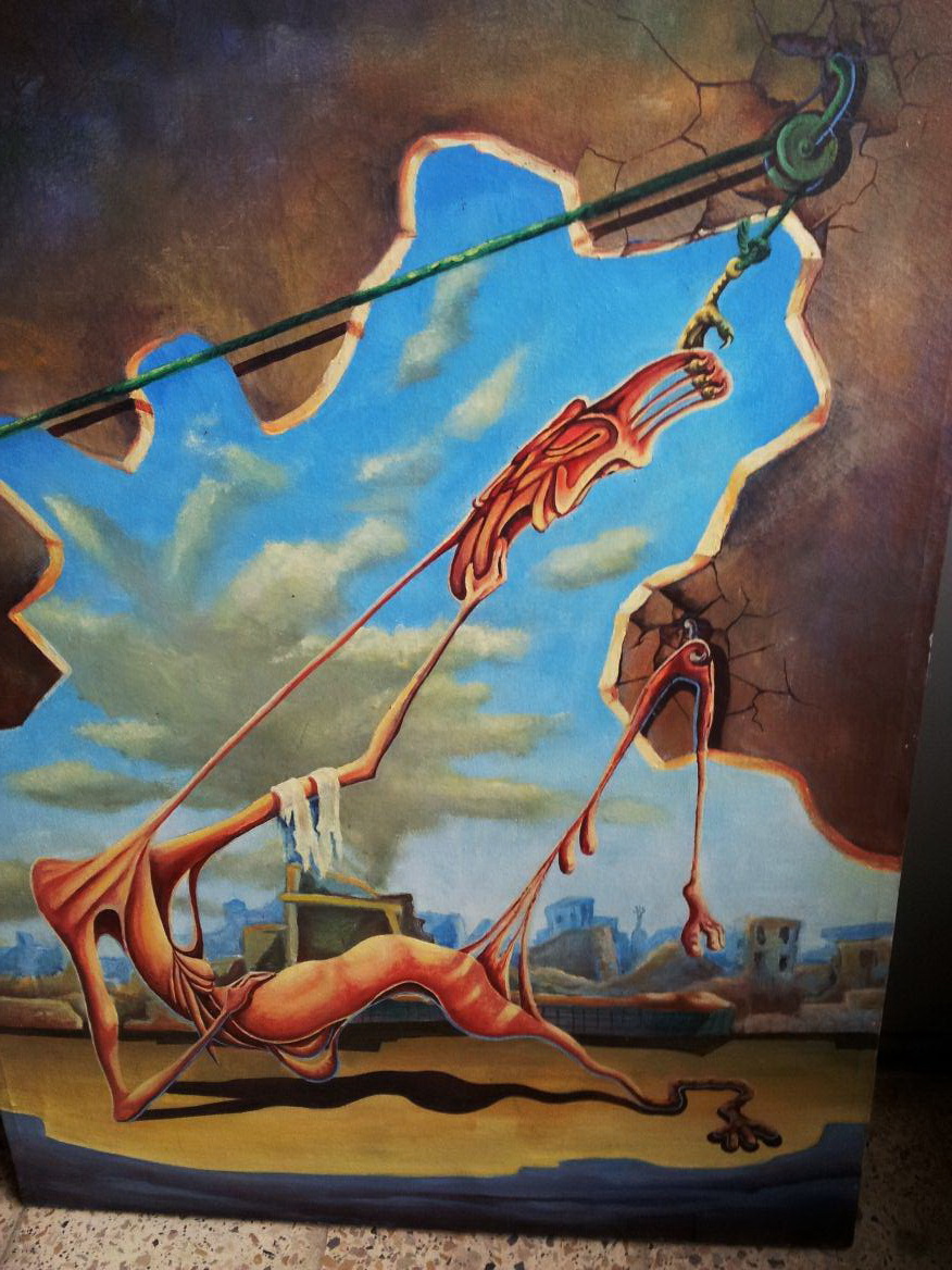 في بنية الفن كما في بنية الحياة تُشكِّل المحاكاة وجوداً أزلياً لا يمكن أن تغيب شمسه, فالمحاكاة قد تكون في عناصر التشكيل التي يقيم عليها الفنان منتجه الابداعي, وقد تظهر في دلالات العمل لأنَّ هذه الدلالات تتكرر في الواقع العياني المعاش دائماً مع الاقرار بتغيرات بعض تفصيلاتها, ولهذا أرى أنَ لوحة (احتجاج) لغزوان تستقي من تجربة الفنان العالمي سلفادور دالي الذي تمثل لوحته تراثاً انسانياً خصباً, إلاَّ أنَّها مع ذلك تحيل إلى تجربة غزوان الحياتية التي تنطلق من وجهة النظر التي تقول بأنَّ العمل الفني قد يكون نتاجاً تقتصر أسبابه وغاياته على الفنان ذاته , ولكنه في الوقت ذاته ينفتح على تجارب الاخرين ويحتويها.