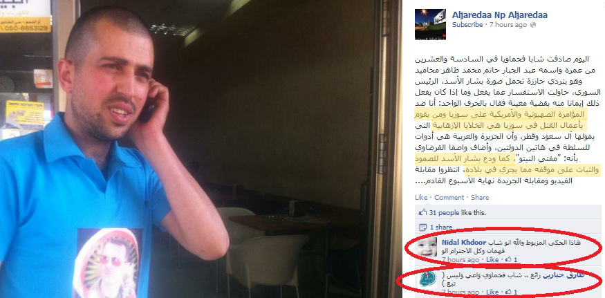ولكنني الى الآن لا أستطيعُ أن اتجاهلَ الحقيقة التي واجهتُها اليوم . فخلال تصفّحي وجدتُ الخبر التالي ، وحقيقة ً .. ولكوني كما يبدو لا زلتُ أعيشُ داخل فقاعتي الورديّة ، ظننت ناشر الخبر ( الجريدة - صحيفة المثلث الأسبوعيّة ) قد فوجئوا لتأييد هذا الشّاب لبشّار الأسد وجاءوا ليردعوه وينصحوه ..