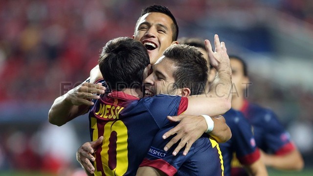 سجل الأهداف أليكسيس سانشيز في الدقيقة 6 وفابريغاس في الدقيقة 65.وضحت الثقة الكتلونية والخوف البرتغالي منذ لحظات المباراة الأولى ، فرغم التحرك الكبير للاعبي بنفيكا ومحاولاتهم الوصول إلى المرمى ومنها تسديدة برونو سيزار في الدقائق الأولى والتي تصدى لها فالديز فإن برشلونة كان قادراً على لدغ بنفيكا في أي لحظة والدليل كان الهدف الأول الذي أحرزه أليكسيس سانشيز في الدقيقة السادسة بعد اختراق لميسي من الجهة اليمنى حيث لعب كرة عرضية للتشيلياني ترجمها بشكل مميز هدفاً أول .بنفيكا حاول تعديل النتيجة أكثر من مرة وكاد أن ينجح في الدقيقة 11 بعد انفراد كامل للبرازيلي ليما لكن فالديز أغلق الزاوية بشكل مميز وأخرج الكرة بشكل رائع ليرد ميسي بكرة رائعة بعد اختراق آخر من أليكسيس لجهة بنفيكا اليمنى تصدى لها الحارس أرتور بشكل رائع برؤوس أصابعه ليهدر بعده سانشيز كرة رائعة فوق المرمى لعبها له فابريغاس من بعيد لينتهي الشوط الأول بلمسة رأسية لأليكسيس أيضاً بعد عرضية مميزة من داني ألفيس لم تترجم إلى هدف ثان مما أبقى النتيجة على ما عليه .