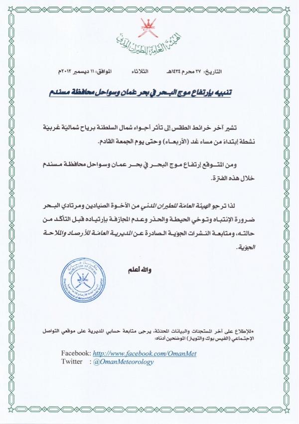 يحذر من هبوب رياح شمالية غربية نشطة إلى قوية، تؤدي إلى اضطراب البحر و ارتفاع الأمواج في الخليج العربي و شمال غرب خليج عمان يومي الأربعاء و الخميس 12 و 13 ديسمبر . و تتسبب الرياح في إثارة الأتربة و الغبار في مسندم و بعض المناطق الساحلية المطلة على شمال غرب السلطنة.
