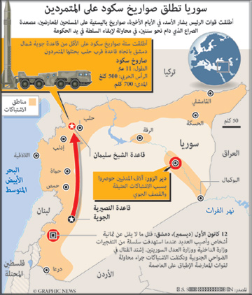 وكان ضابط منشق خدم في كتيبة صواريخ ارض ارض في محافظة ريف دمشق أكد ل”فرانس برس”، أمس، أن قوات النظام أطلقت صواريخ من طراز ''سكود'' قبل 3 أيام في اتجاه مناطق يسيطر عليها المعارضون .