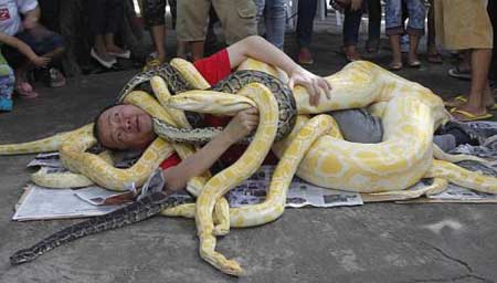 [h=3]رجل يلف مجموعة من الثعابين حوله احتفالا بالعام الجديد[/h]