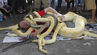 لف رجل حول جسده مجموعة من الثعابين، وكان معظمها من نوع ألبينو بايثون البورمية، كجزء من عرض الاحتفال بالسنة القادمة، وذلك فى مدينة مالابون شمال مانيلا عاصمة الفلبين.