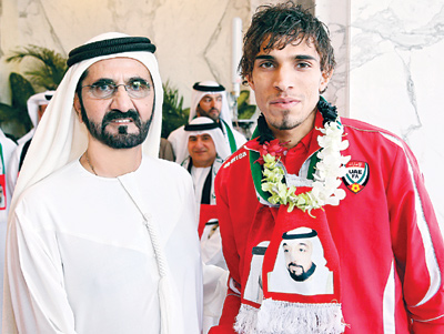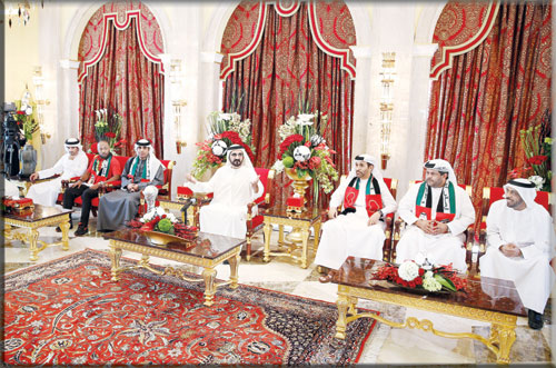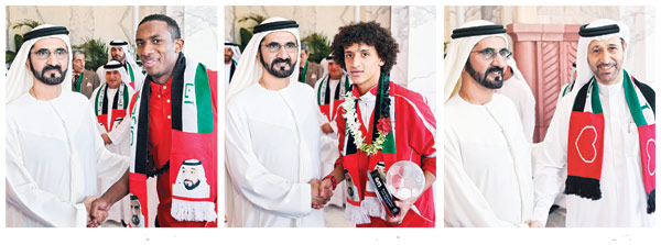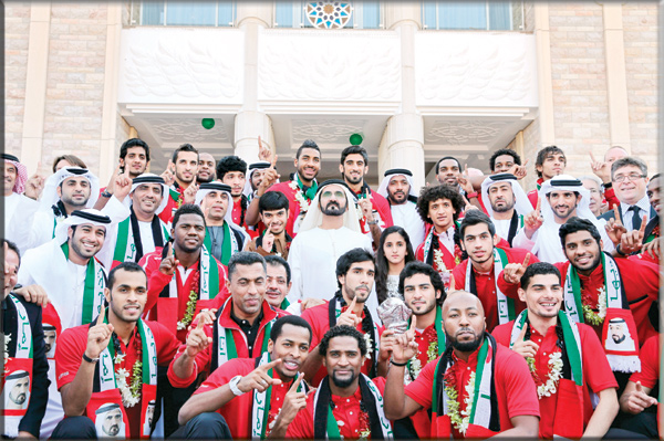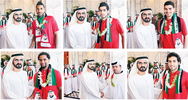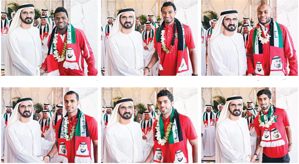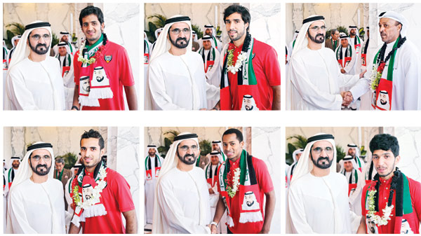 في حفل جميل توافرت له كل أسباب النجاح وكل مظاهر البهجة بالإنجاز الخليجي لمنتخب الإمارات، استقبل صاحب السمو الشيخ محمد بن راشد آل مكتوم نائب رئيس الدولة رئيس مجلس الوزراء حاكم دبي، رعاه الله، في قصر سموه في زعبيل ظهر أمس، وأمر سموه بتخصيص مبلغ 50 مليون درهم مكافأة لبعثة المنتخب الوطني تقديراً من سموه لهذا الإنجاز الرياضي الكبير .