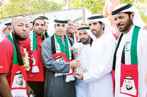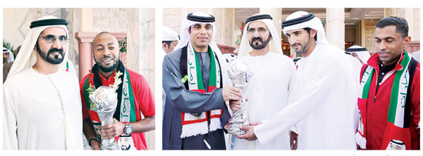 وحرص سموه على استقبال الأبطال عند مدخل القصر، حيث تسلم سموه في بداية اللقاء كأس البطولة من كابتن الفريق إسماعيل مطر، ثم صافح سموه أعضاء الفريق وأعضاء اللجان الإدارية والفنية والإعلاميين، وهنأهم على هذا الإنجاز الوطني الكبير الذي أدخل البهجة والفرح إلى قلوب أبناء وبنات الإمارات، وأهل الخليج عامة بفضل الأداء الجميل الذي نال استحسان وإعجاب كل المراقبين والمتابعين للبطولة في المنطقة .