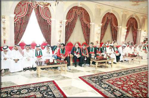 بتوجيهات من سمو الشيخة هند بنت مكتوم بن جمعة آل مكتوم حرم صاحب السمو الشيخ محمد بن راشد آل مكتوم جرى للمنتخب خلال الاستقبال احتفال كبير ظهرت علاماته من قبل الوصول إلى قصر سموه في زعبيل، حيث كان المظليون يحلقون في السماء بأعلام الإمارات، وعند الوصول كانت الأهازيج الوطنية تنطلق عبر مكبرات الصوت، وبخاصة أغنية “منصور” الشهيرة، بينما كانت زهرات من الإمارات يستقبلن الجميع بباقات الزهور الملونة بالأحمر والأبيض والأسود، وفوق الجميع كانت أقواس النصر بالألوان نفسها في مدخل قصر زعبيل الذي ازدانت جنباته وردهاته بصور ضخمة تسجل لحظات التتويج بكأس البطولة، وقد أشرف على تمام هذه التجهيزات وتنفيذها خليفة سعيد سليمان المدير العام لدائرة التشريفات والضيافة في دبي .