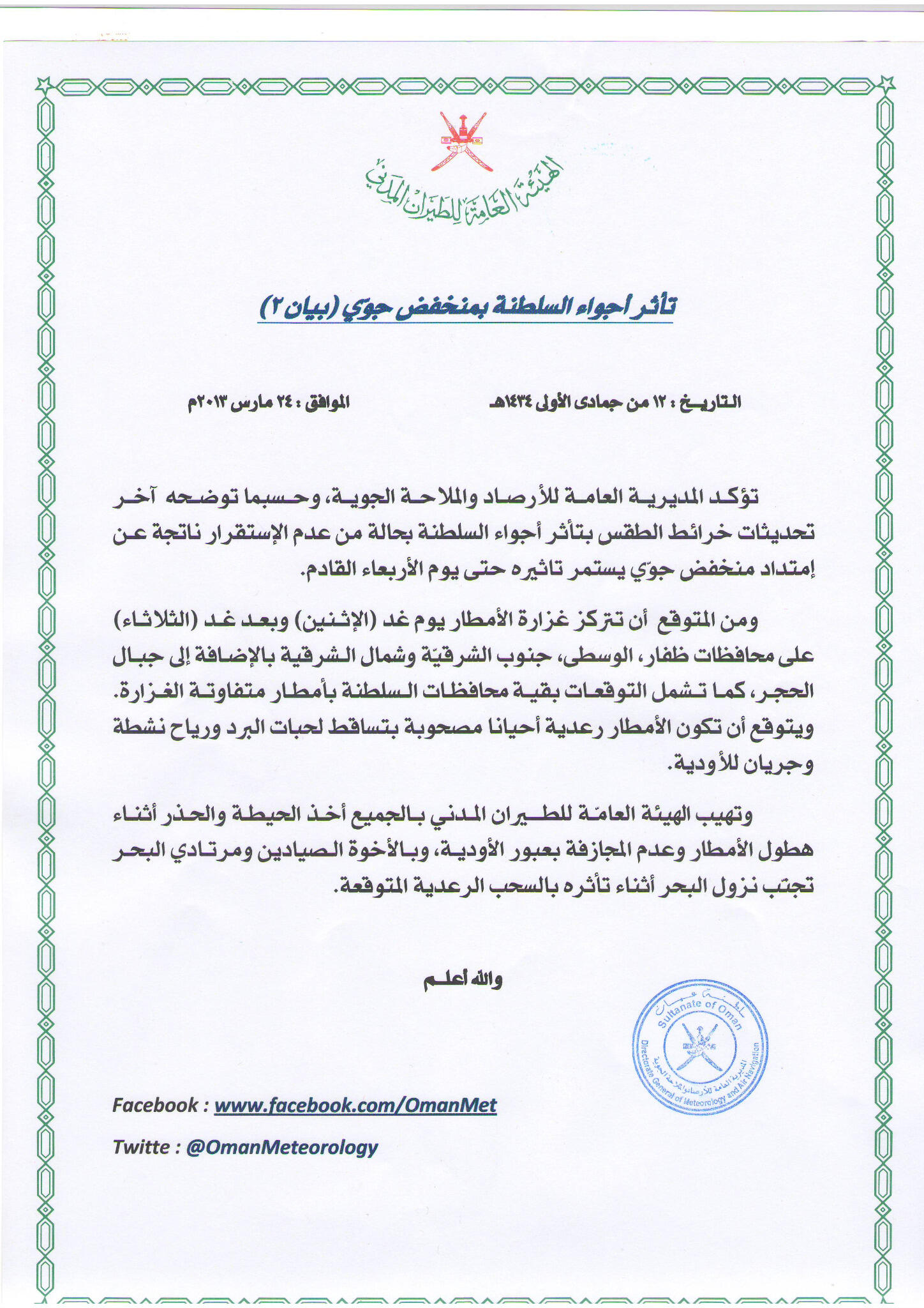 تــأثـر أجــواء السلطنـة بمنخفـض جــوي