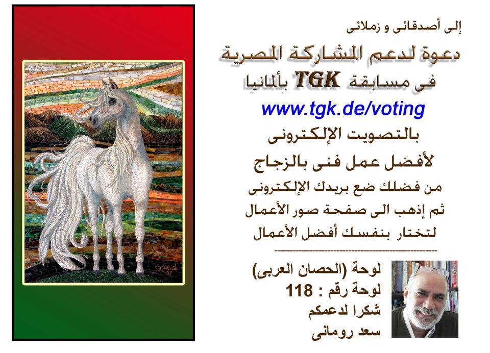 1 سعد روماني :) - جديد shams-elnahar 28 أبريل 2013، 2:33 ده لينك مسابقة داخلها الفنان المصري سعد روماني وعايزين نصوت للوحة الحصان العربي اللي هي فوق دي عايزة اشوف الهمة بقا المصدر : مدونة shams-elnahar