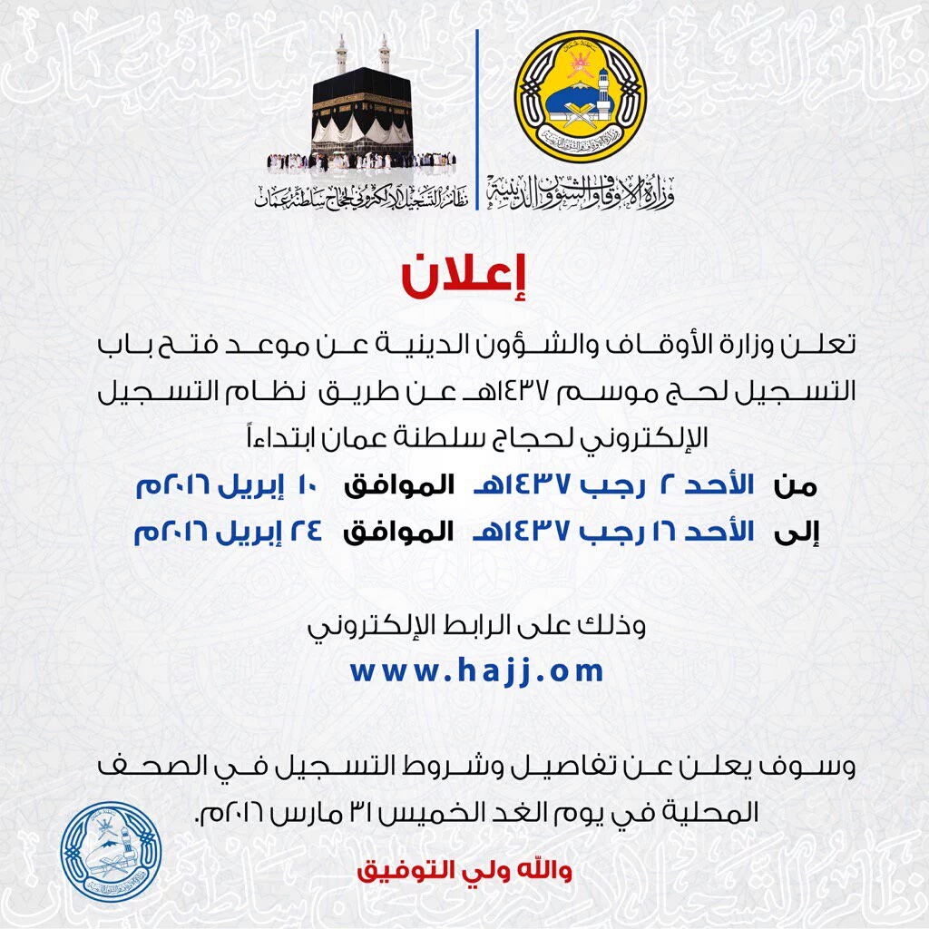 تعلن وزارة الأوقاف والشؤون الدينية للمواطنين الراغبين في أداء مناسك الحج لهذا العام 1437هـ عن فتح باب التسجيل للحجاج العمانيين عبر برنامج التسجيل الالكتروني لحجاج سلطنة عمان وذلك اعتبارا من يوم الأحد بتاريخ 2 من شهر رجب إلى يوم الأحد 16 من شهر رجب 1437هـ الموافق له 10 إبريل 2016م إلى 24إبريل 2016م وذلك وفق الضوابط والاشتراطات التالية: